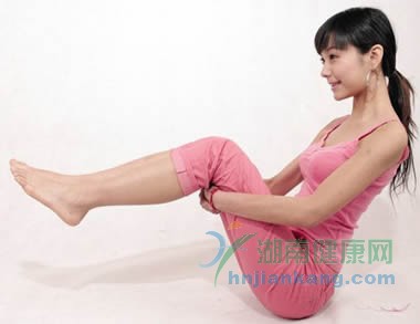 将手放在大腿并将腿往上提起,上半身往后倾倒成V字型,不要停止呼吸,保持30秒不动。
